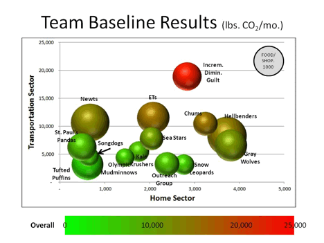 Each team's baseline data is represented by a bubble. The color represents the overall footprint magnitude (according the color scale at the bottom); the size of the bubble represents the Food/Shopping footprint size (according to the circle in the upper right) and the horizontal and vertical positions of each team's bubble represents its Home and Transportation footprints.